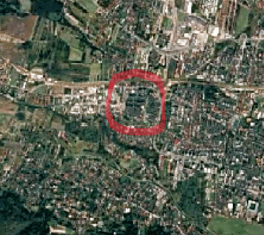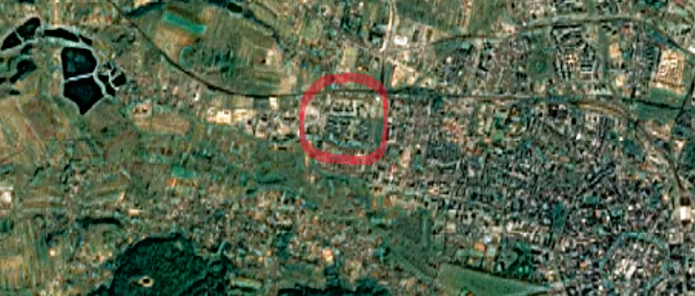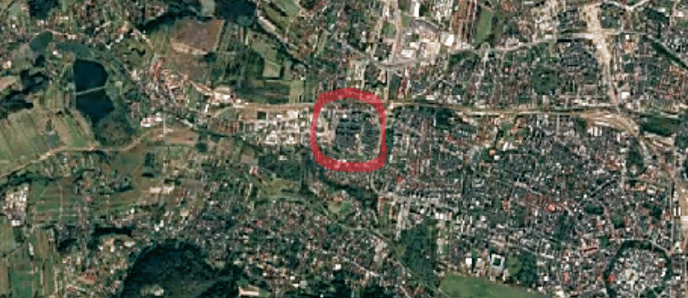 Osiedle Widok (in red) amid suburban sprawl. google earth engine timelapse shows decades of development encroachment.