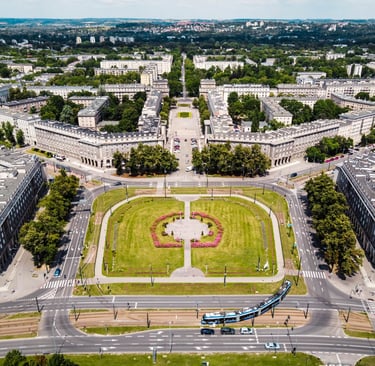 By design, Nowa Huta's sectors housed 4,000–5,000 residents each, complete with schools, shops, cultural centers, communal spaces, and abundant green areas. The result was a district with wide, hierarchical street structures radiating from a central plaza, rich tree canopies, and in-built self-sufficiency. Residents could meet all daily needs within walking distance - which is a 15-minute neighborhood, by definition.